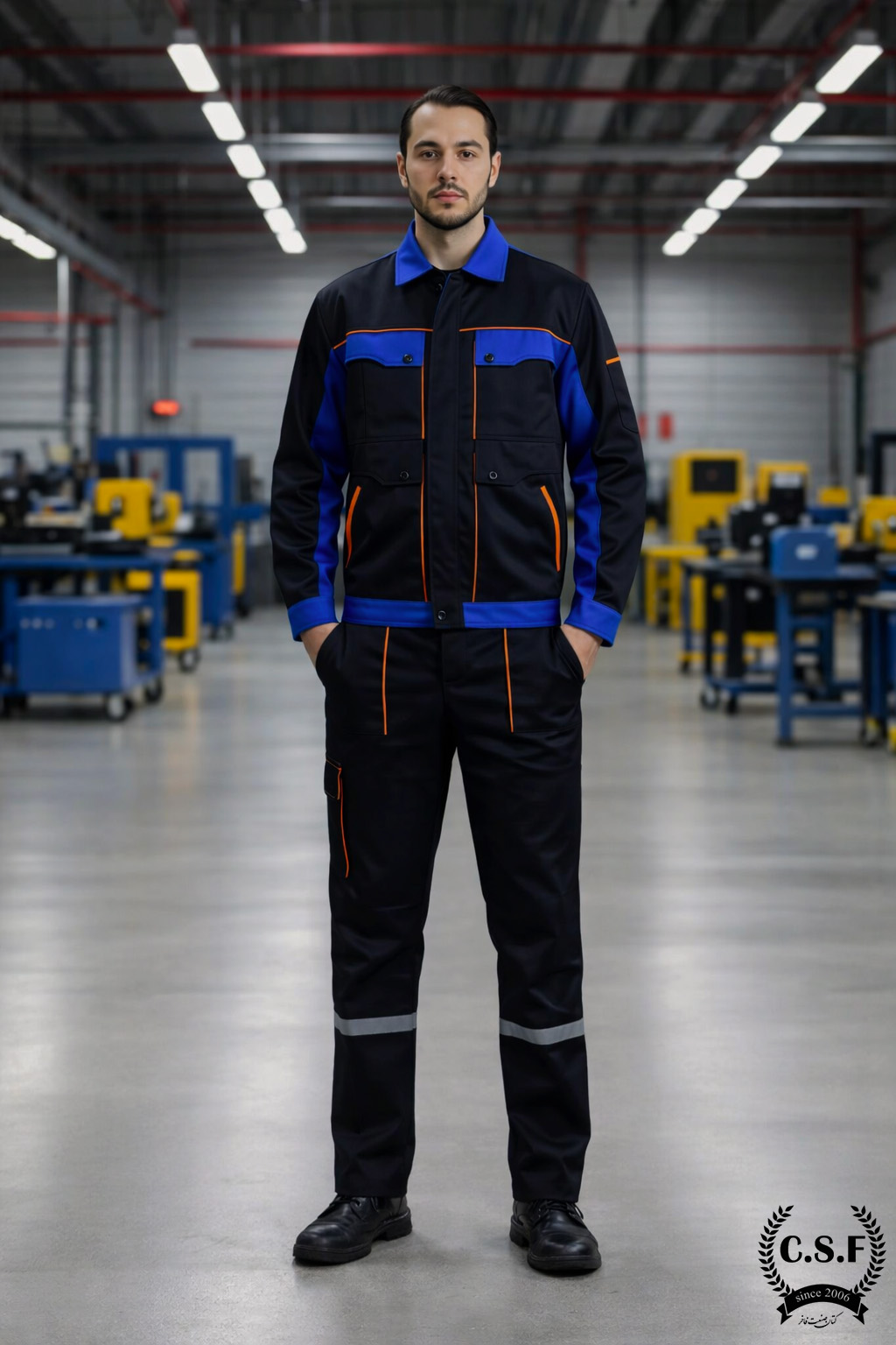 ست لباس کار مهندسی ، دو رنگ مشکی-آبی با نوار نارنجی